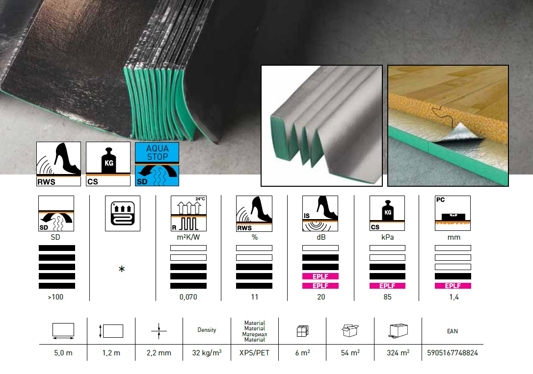 Dvojvrstvá podložka pod plávajúce podlahy vytvorená z XPS platne a hliníkovej fólie . Vďaka tejto skladbe je schopná zabrániť prestupu vlhkosti z podkladu do podlahy . Inovatívny systém poskladaného pásu podložky umožňuje veľmi jednoduchú a rýchlu inštaláciu na podlahu . Odolnosť voči zaťaženiu až 8,5 t/m2 , vysoká schopnosť redukovať krokový a akustický hluk a vyrovnávanie lokálnych nerovnosti do 1,4 mm . Podložka má tepelný odpor 0,07 m2K/W a preto je vhodná na podlahové vykurovanie iba s podlahovinami , ktorých tepelný odpor je nižší ako 0,08 m2K/W .